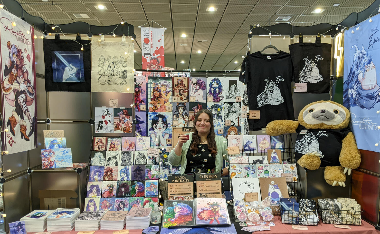 I began my convention journey in 2013 with a very humble selection at MMC Berlin. For the next two years I stayed in Berlin, and in 2015 I finally made my first trip to Düsseldorf for DoKomi.Back then my table looked very different from today. I only had two postcard designs, painted on T‑shirts, crafted small trading cards by hand, and offered a few prints. At that time I could not imagine that one day I would be able to live from my art through exhibiting at conventions.In this gallery you can see how things slowly grew and changed... from those first modest attempts to more complete stands. Please note: I did not always take photos of my tables, so there are some gaps and not necessarily the best pictures. Still, they give a nice impression of how the journey unfolded step by step.