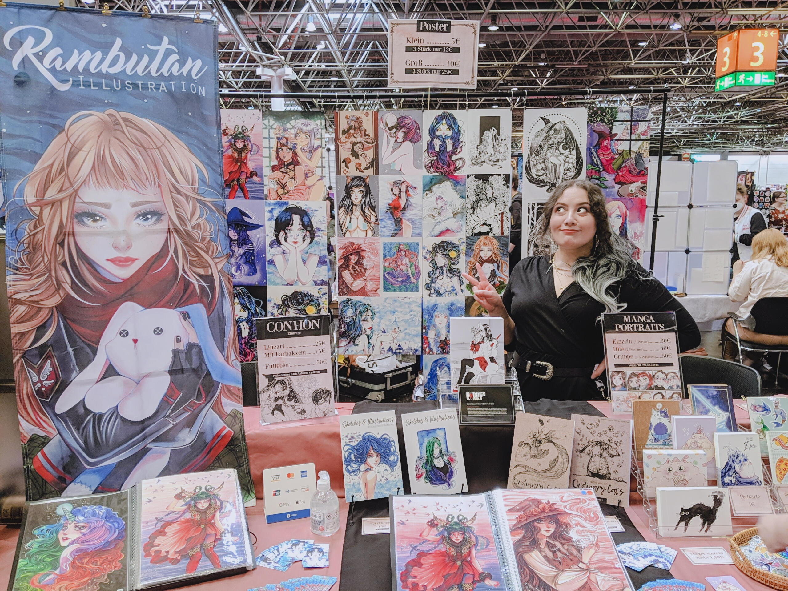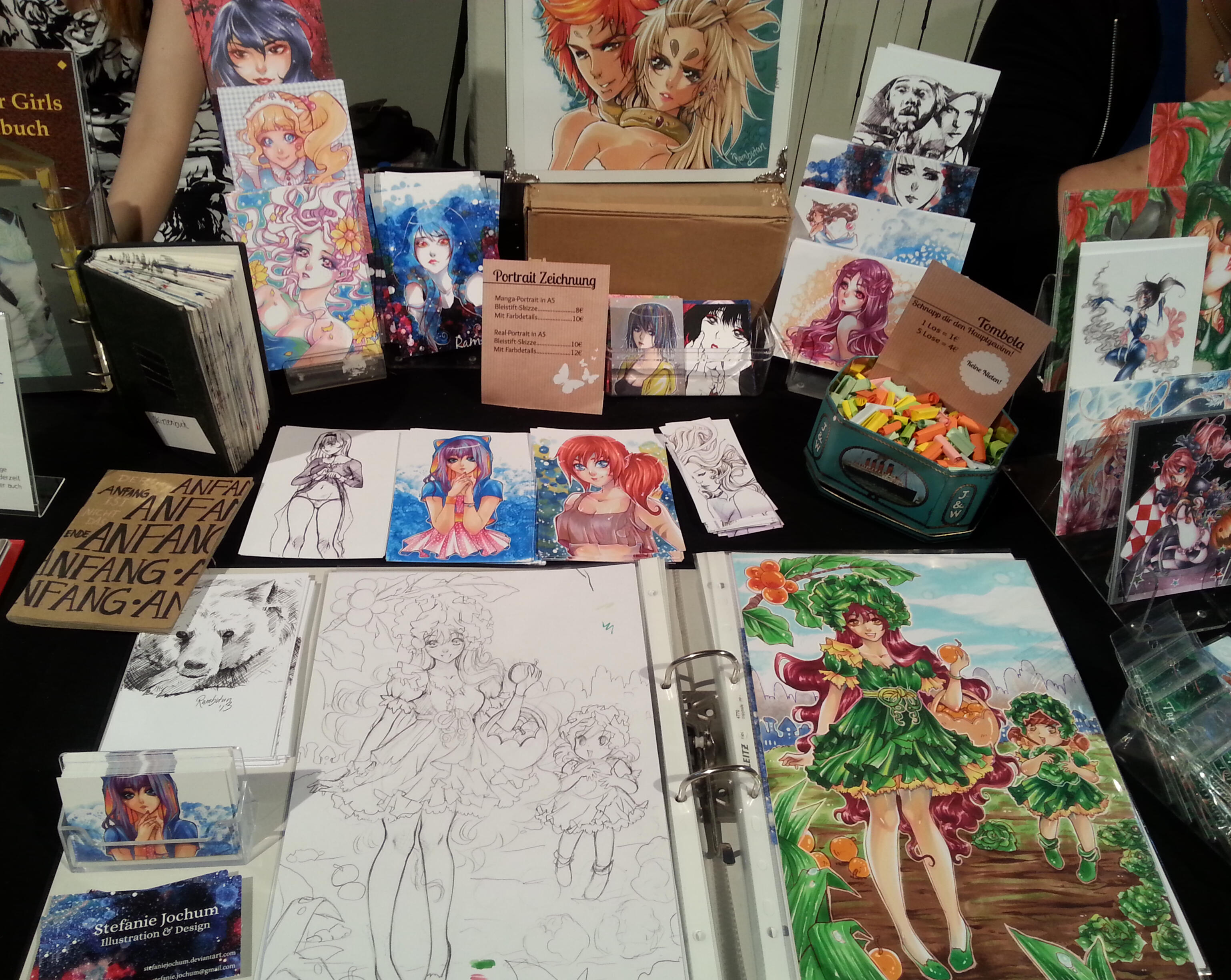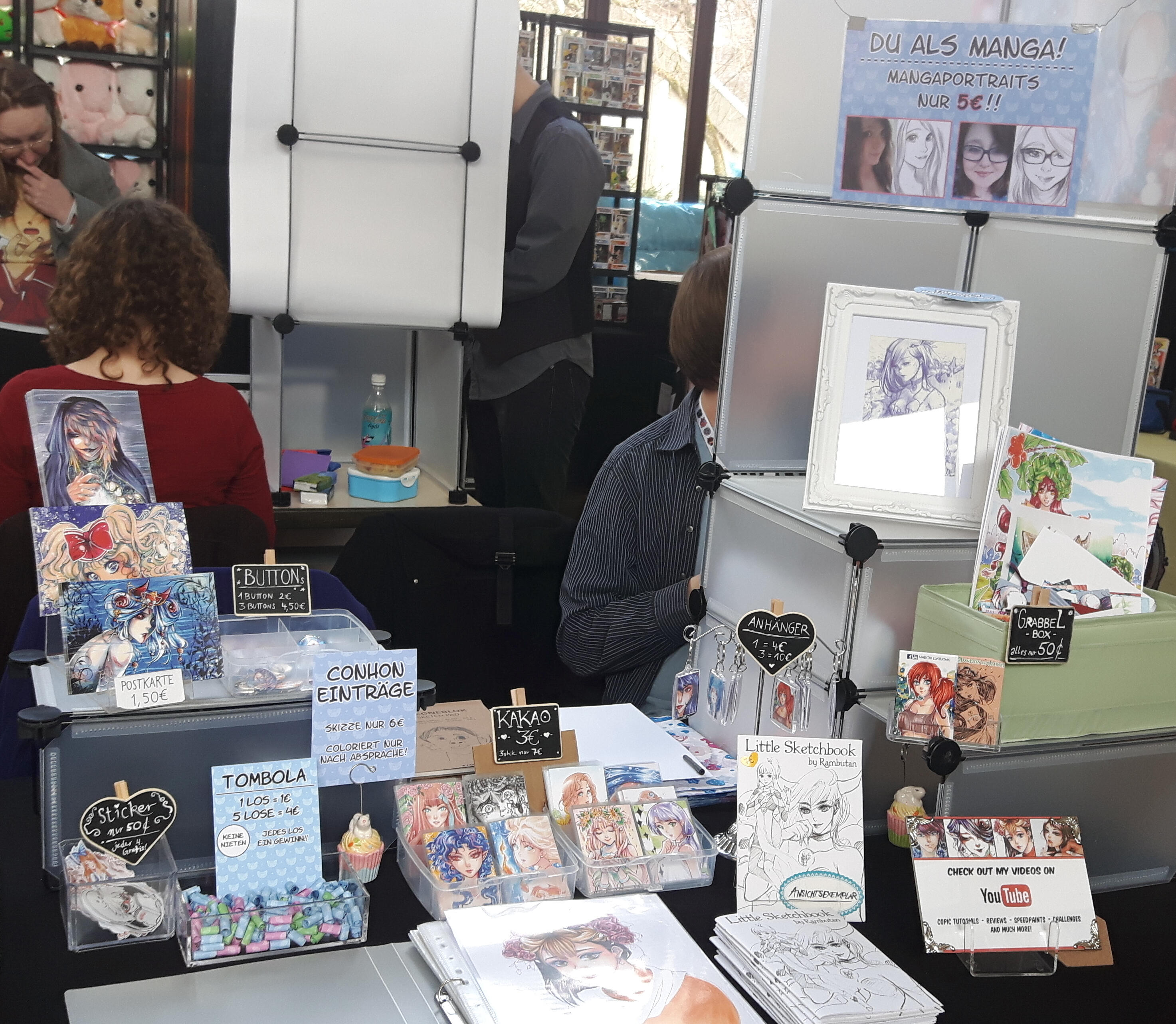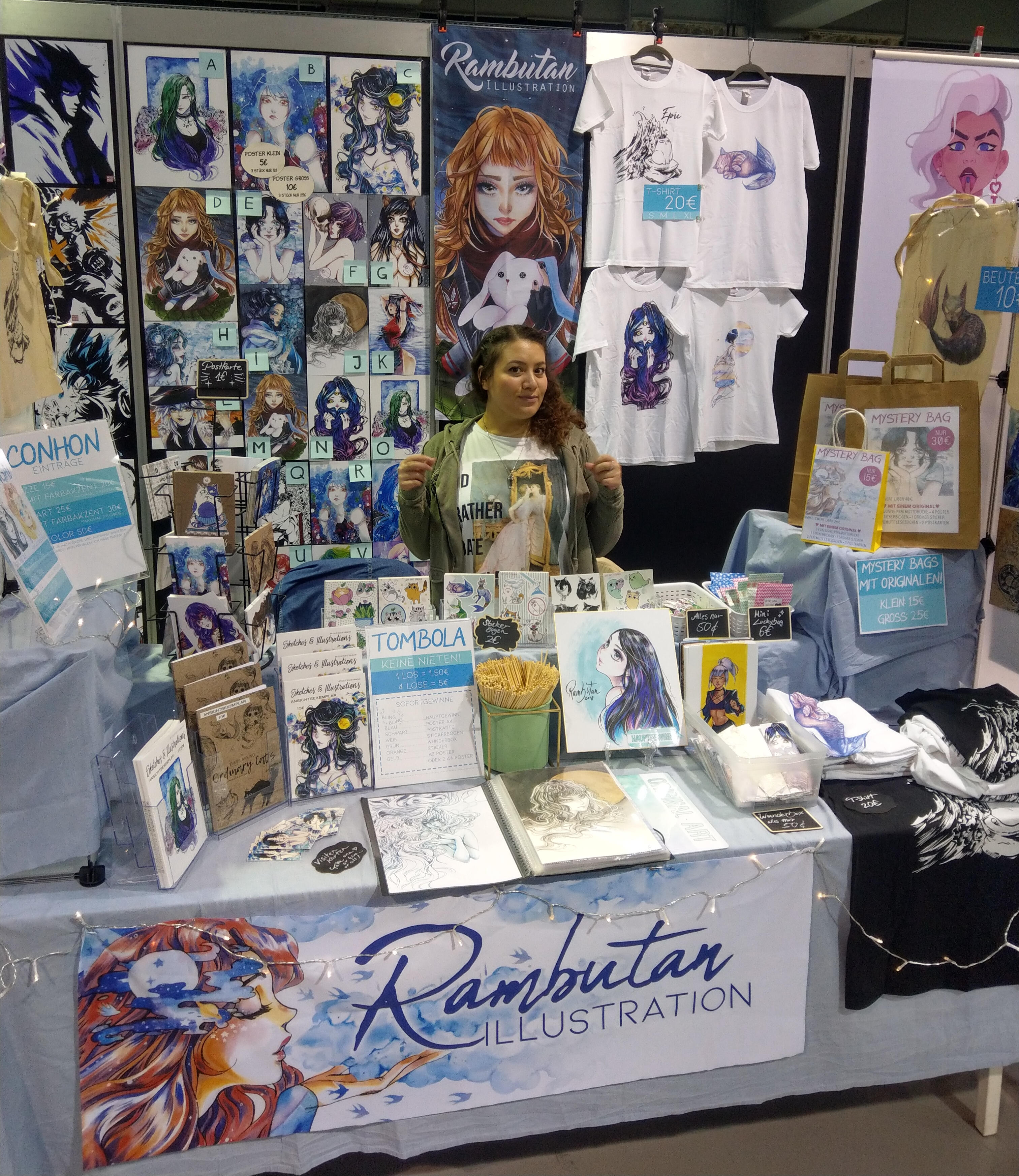 I began my convention journey in 2013 with a very humble selection at MMC Berlin. For the next two years I stayed in Berlin, and in 2015 I finally made my first trip to Düsseldorf for DoKomi.Back then my table looked very different from today. I only had two postcard designs, painted on T‑shirts, crafted small trading cards by hand, and offered a few prints. At that time I could not imagine that one day I would be able to live from my art through exhibiting at conventions.In this gallery you can see how things slowly grew and changed... from those first modest attempts to more complete stands. Please note: I did not always take photos of my tables, so there are some gaps and not necessarily the best pictures. Still, they give a nice impression of how the journey unfolded step by step.