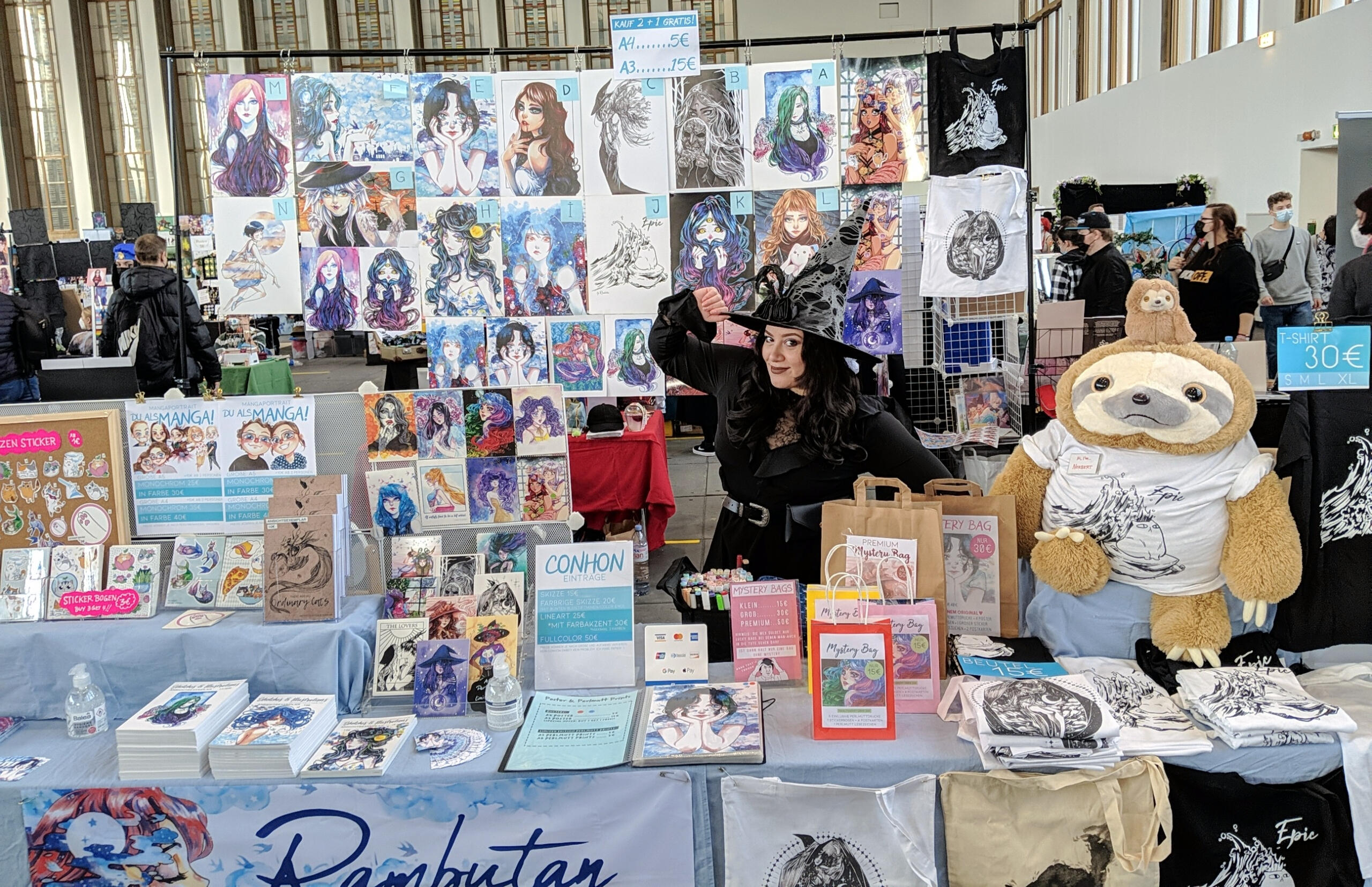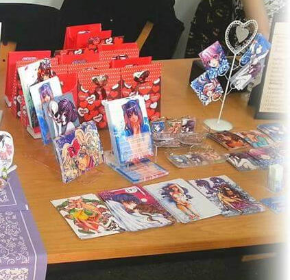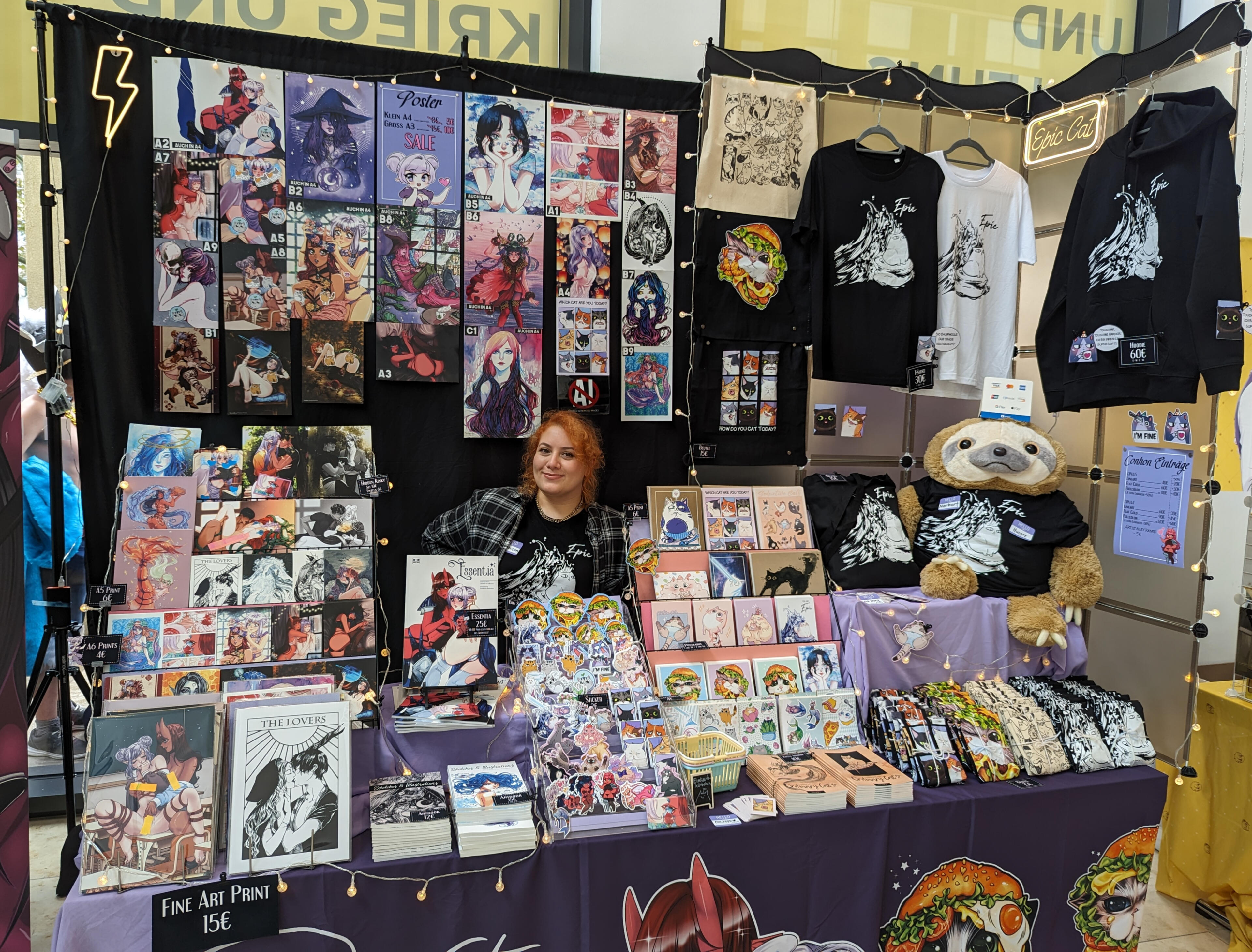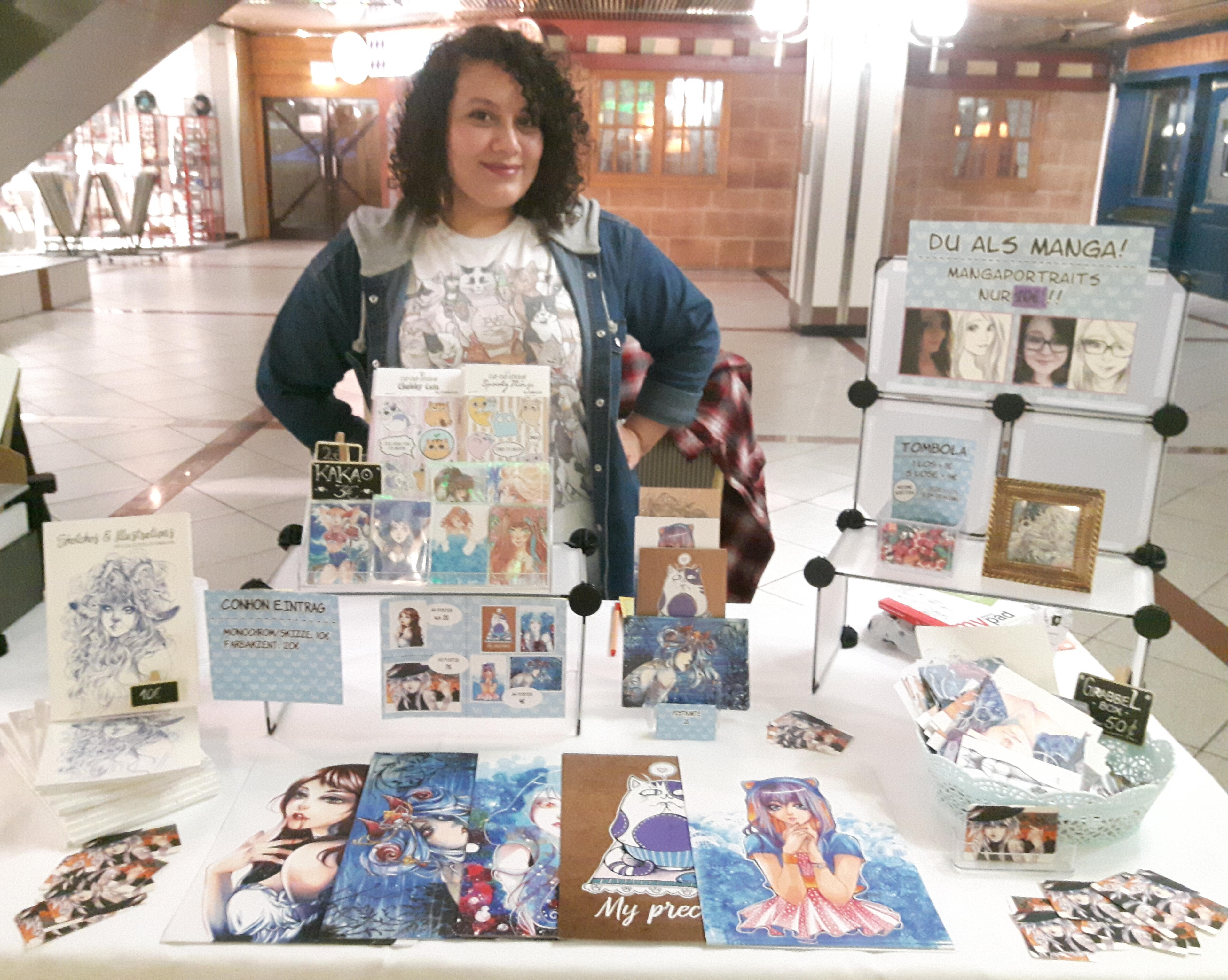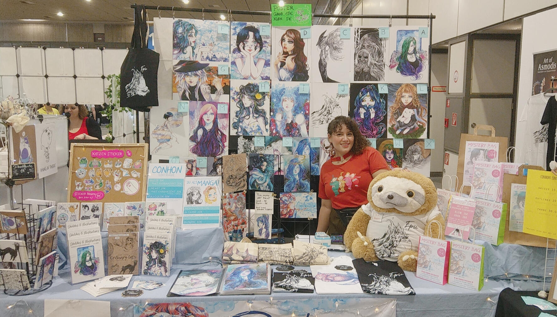 I began my convention journey in 2013 with a very humble selection at MMC Berlin. For the next two years I stayed in Berlin, and in 2015 I finally made my first trip to Düsseldorf for DoKomi.Back then my table looked very different from today. I only had two postcard designs, painted on T‑shirts, crafted small trading cards by hand, and offered a few prints. At that time I could not imagine that one day I would be able to live from my art through exhibiting at conventions.In this gallery you can see how things slowly grew and changed... from those first modest attempts to more complete stands. Please note: I did not always take photos of my tables, so there are some gaps and not necessarily the best pictures. Still, they give a nice impression of how the journey unfolded step by step.