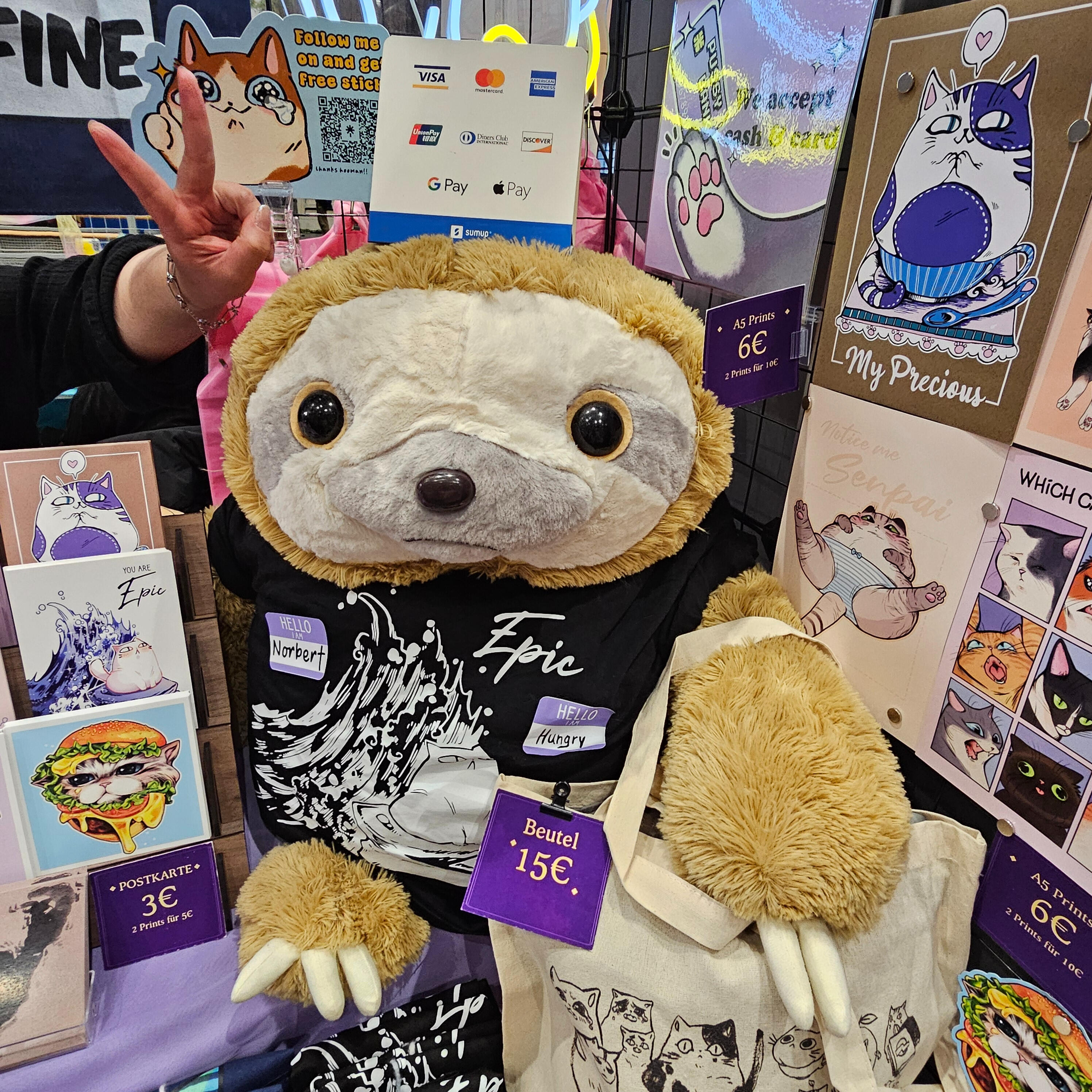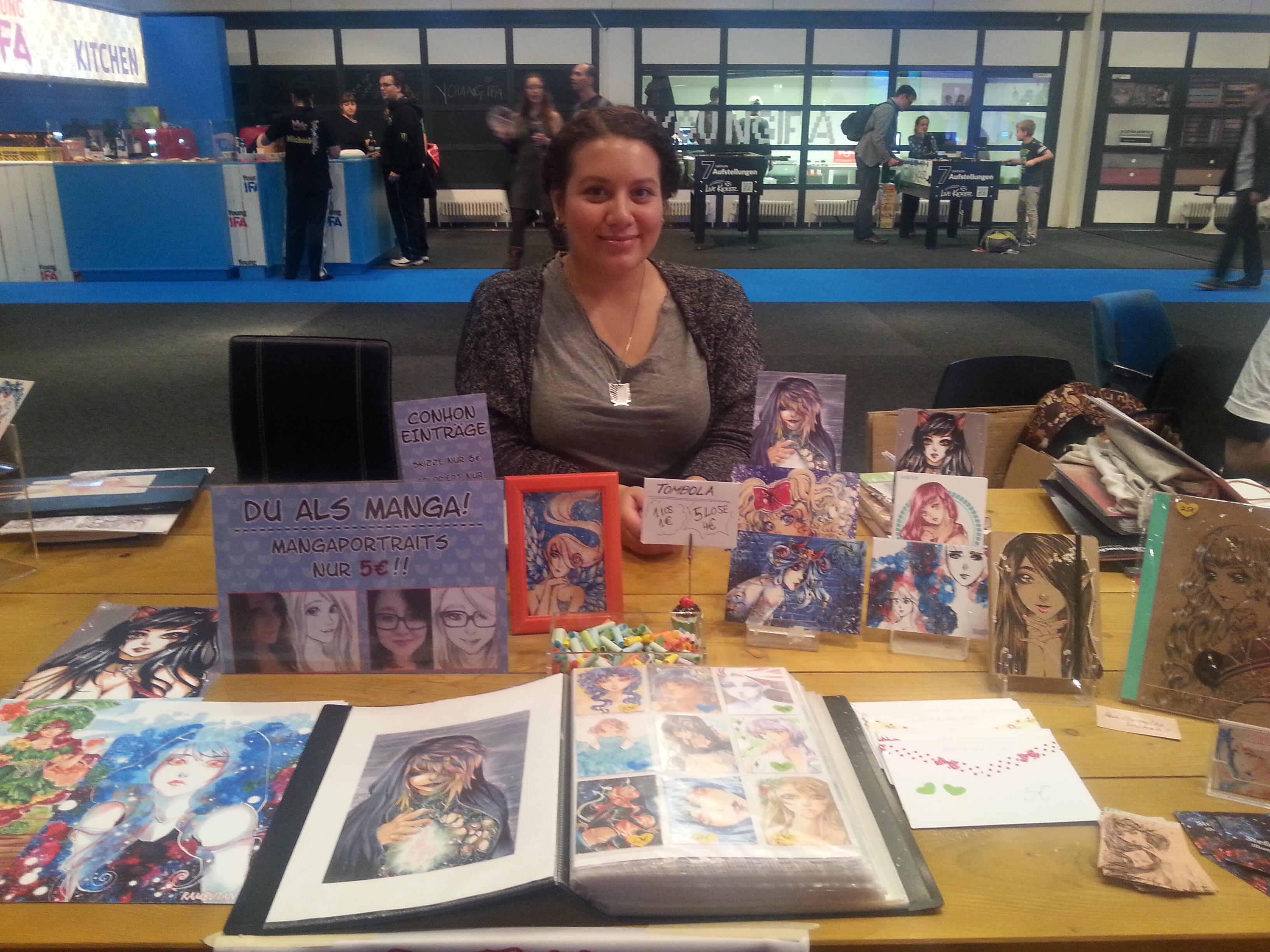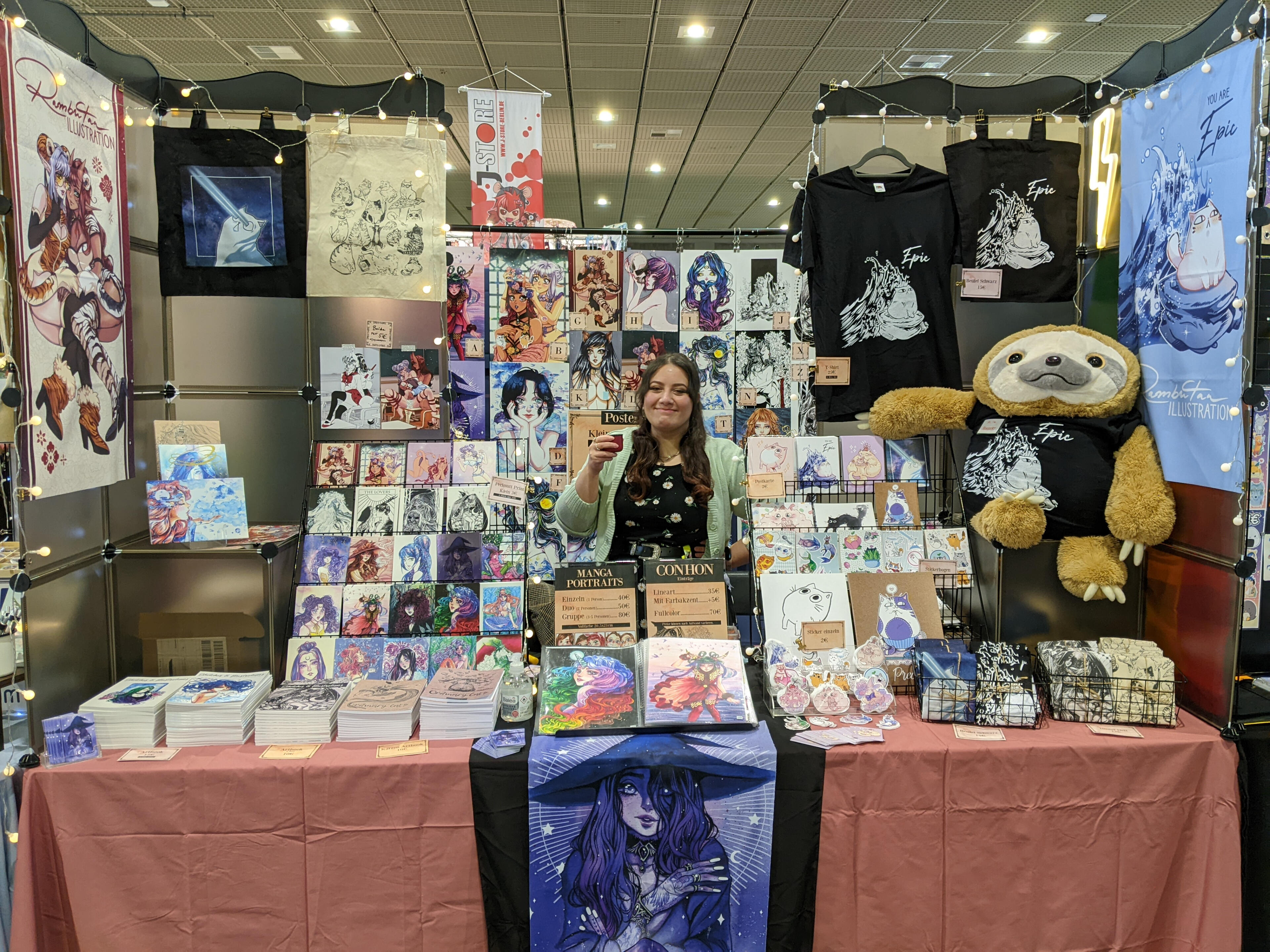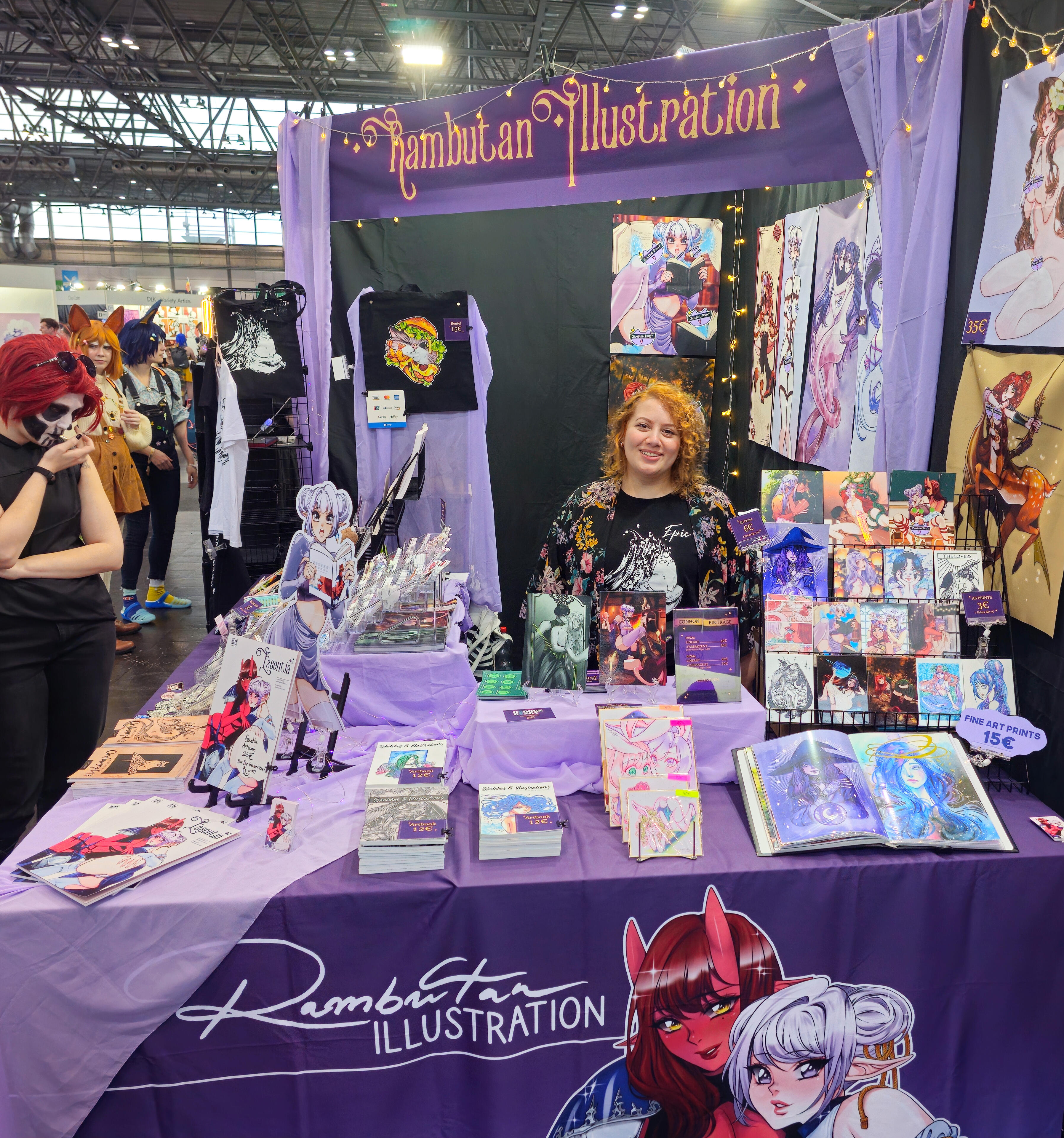 I began my convention journey in 2013 with a very humble selection at MMC Berlin. For the next two years I stayed in Berlin, and in 2015 I finally made my first trip to Düsseldorf for DoKomi.Back then my table looked very different from today. I only had two postcard designs, painted on T‑shirts, crafted small trading cards by hand, and offered a few prints. At that time I could not imagine that one day I would be able to live from my art through exhibiting at conventions.In this gallery you can see how things slowly grew and changed... from those first modest attempts to more complete stands. Please note: I did not always take photos of my tables, so there are some gaps and not necessarily the best pictures. Still, they give a nice impression of how the journey unfolded step by step.