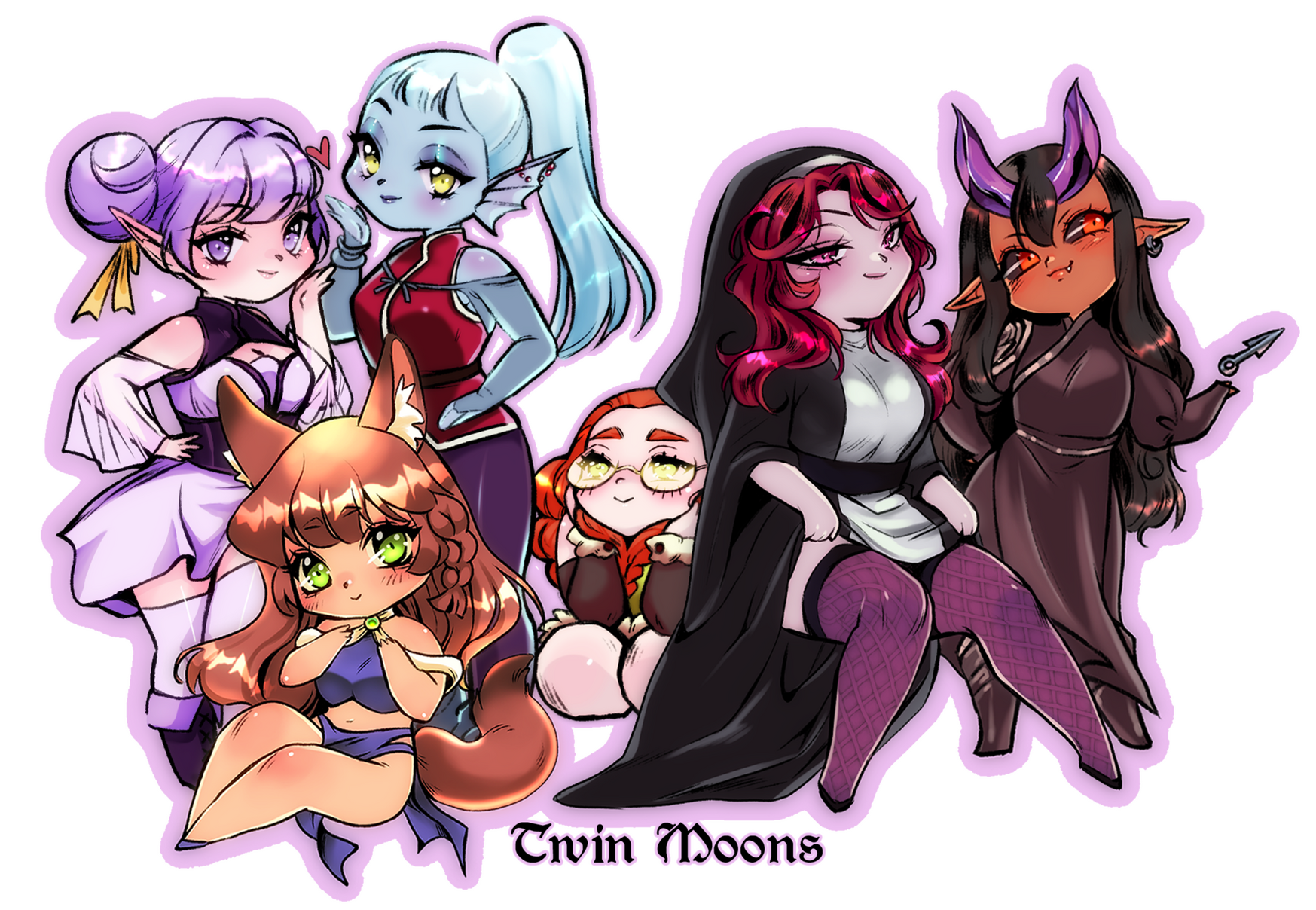 Guild of the Twin Moons A con-exclusive collector’s campaign by Rambutan Illustration. Built like a story-driven D&D adventure, it follows female protagonists through lustful encounters across diverse fantasy settings, always with other female creatures. Yuri only.